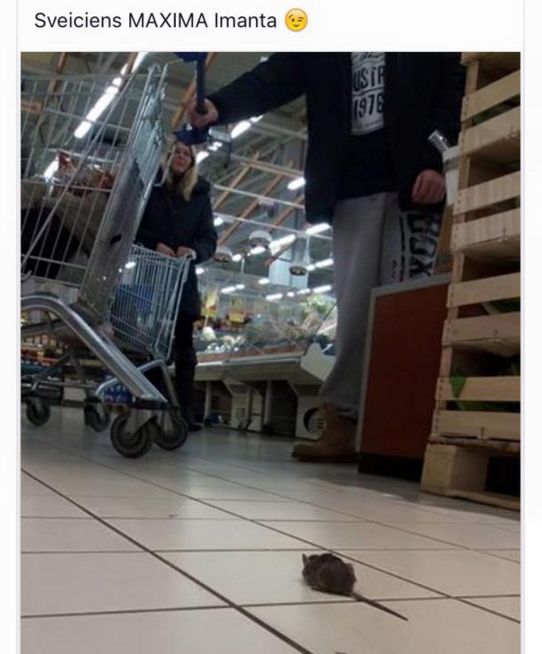 Attēlā redzama maza pelīte, kas netraucēti mēro savu ceļu pa lielveikala "Maxima" tirdzniecības zāli.