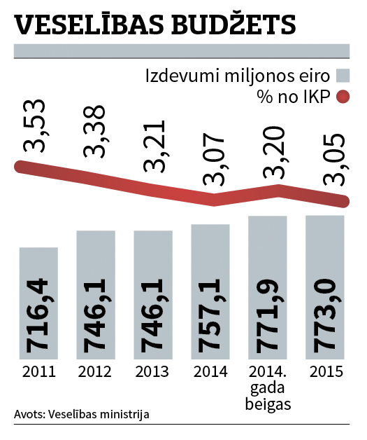 Skumjā gaisotnē noritēja Saeimas Sabiedrības veselības apakškomisijas sēde, apspriežoties par nākamā gada veselības nozares budžetu. Ja raugās uz veselības budžeta finansējumu nākamgad absolūtos skaitļos, jāsecina, ka tas ir nedaudz lielāks nekā šogad – 771,9 miljoni eiro šogad, 773 miljoni eiro nākamgad. Taču, pārrēķinot izdevumus attiecībā pret iekšzemes kopproduktu, noplok pat pēdējais optimisms. Nākamgad veselības nozares finansējums būs 3,05% no IKP, šogad tas saskaņā ar gada sākuma plānu – 3,07, gada beigās – 3,2%. «Praktiski tas nozīmē, ka nekādu izmaiņu nebūs,» secina jaunā VM valsts sekretāre Solvita Zvidriņa. Pēdējo desmit gadu laikā tik zems rādītājs veselības izdevumiem pret IKP nav bijis. Latvija turpinās būt pēdējā Eiropas Savienībā pēc veselībai atvēlētā finansējuma no kopējiem budžeta izdevumiem – 9,3% (ES vidēji – 14%), kā arī valsts, kur iedzīvotājiem visvairāk par veselības pakalpojumiem jāmaksā pašiem – valsts sedz 56% (salīdzinājumam Čehijā, Dānijā – 85, Igaunijā, Itālijā, Lielbritānijā – 80, Lietuvā, Vācijā, Francijā – 70%).