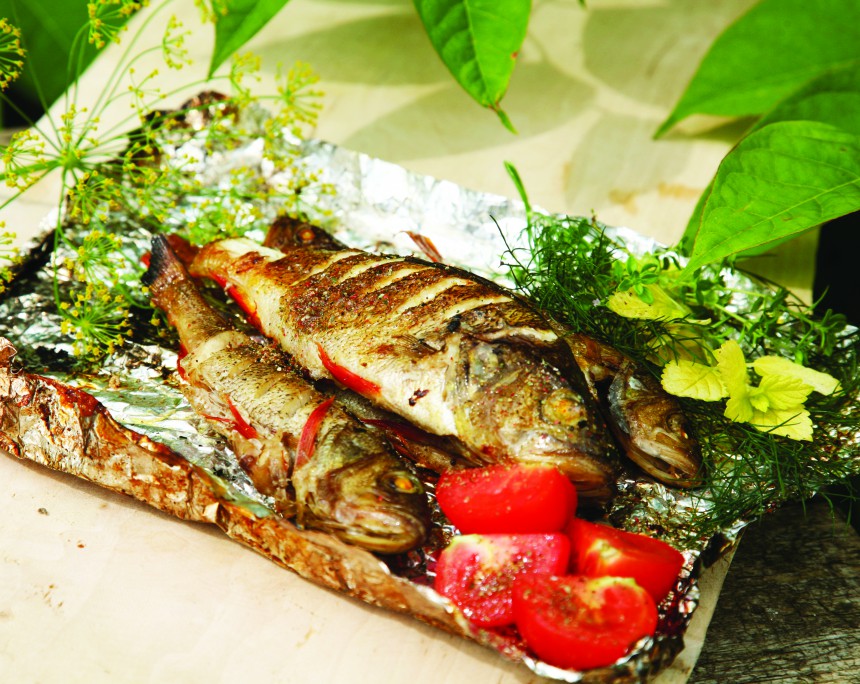 4. Kad zivis jau gatavas, folija paciņu noņem no grila, atloka, asariem pārkaisa smalki kapātus garšaugus.