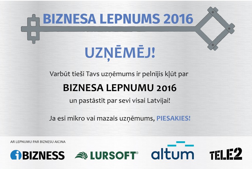 No 16.maija, līdz 6.jūnijam žurnāls “iBizness” aicina mazos un mikro uzņēmumus pieteikties balvai BIZNESA LEPNUMS 2016. Uz balvu var pretendēt uzņēmumi, kuri ieviesuši inovatīvu produktu, īstenojuši oriģinālu produkta virzības stratēģiju, apguvuši jaunus tirgus, lepojas ar strauju apgrozījuma pieaugumu vai augstiem produktivitātes rādītājiem.
