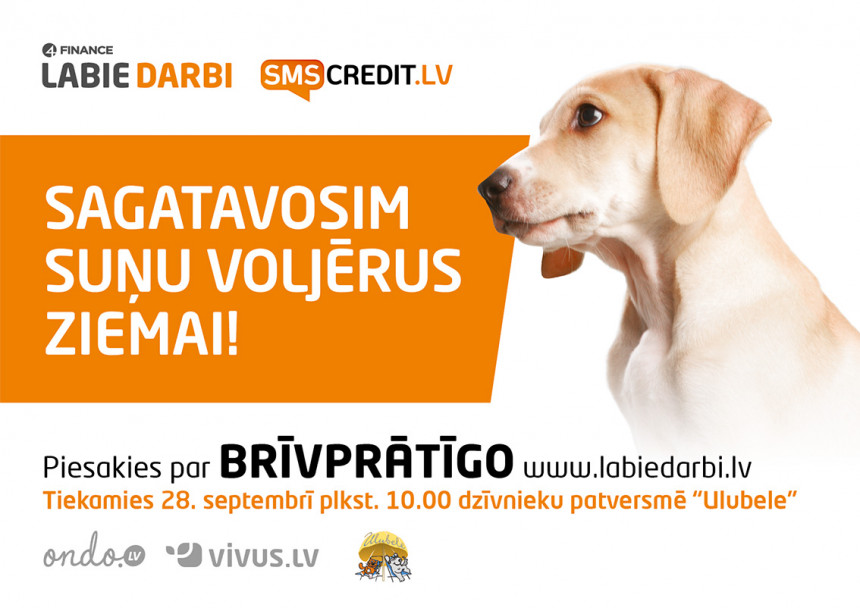 Rudenim iesākoties laiks ķerties pie āra darbiem, tāpēc ar prieku paziņojam, ka jau trešo gadu pēc kārta “4finance Labie Darbi” un SMScredit.lv aicina uz lielo rudens darbu - talku dzīvnieku patversmē “Ulubele”. Šogad kopīgiem spēkiem plānots sagatavot suņu voljērus ziemai un sakopt patversmes teritoriju.