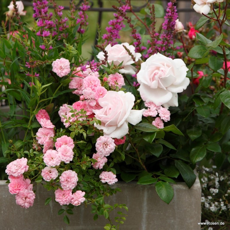 Roze 'Garden Of Roses'. Floribundroze - Kordes roze. Ziedi: rozetes formas, krēmīgi rozā toņos, blīvi pildīti. Piemīt izteikts, smalks aromāts. Ziedu skaits uz kāta 3-5. Zieda diametrs 6-7 cm. Krūms: kompakts, neliels. Augstums 60 cm, platums 40-50 cm. Atkārtota ziedēšana.