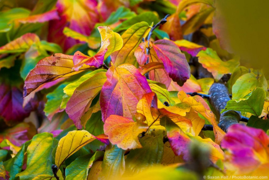 Apvērstās olas formas, ādai līdzīgās, spīdīgās lapas ir tumši sarkanas, kad tās tikko parādās pavasarī un vasarā kļūst tumši zaļas. Jau jūlijā sākas iespaidīga rudens krāsu maiņa uz tumši sarkanu un violeti sarkanu. Miza ir violeti pelēka, un tā lobās ar skaistu maskēšanās rakstu.