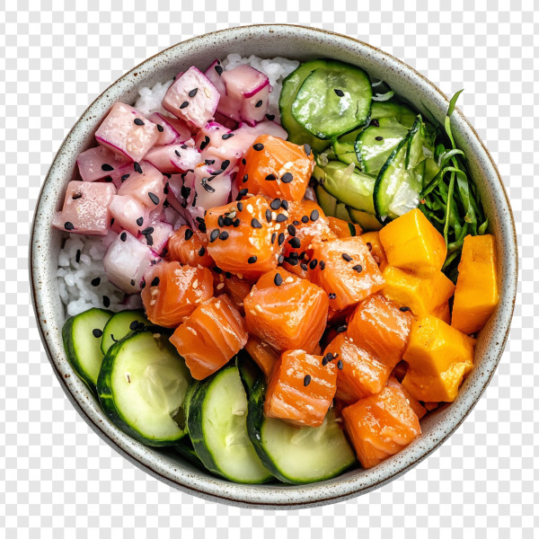 Bļoda ar gurķi, rīsiem, avokado, lociņiem, nori, marinētiem redīsiem, mango, ceptu tofu un mikrozaļumiem.
