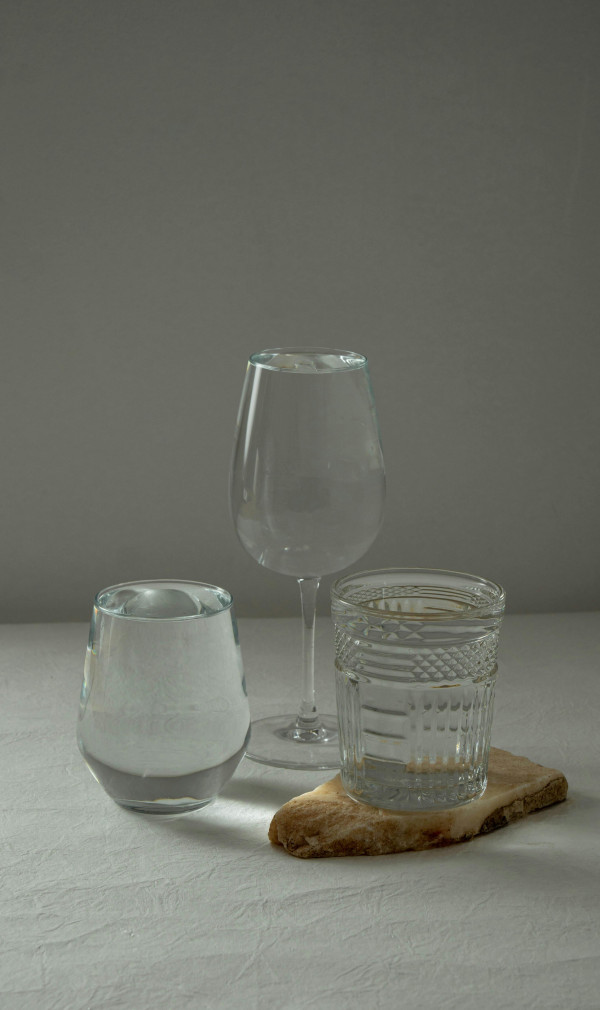 Ideālā gadījumā glāze ir izgatavota no plāna, kvalitatīva stikla. Jo plānāka mala, jo ūdens plūst vieglāk, bez “šķēršļa” sajūtas, un tas rada tīrāku garšas uztveri. Biezas malas bieži rada smagnēju iespaidu un pat nedaudz maina to, kā ūdens nonāk mutē.