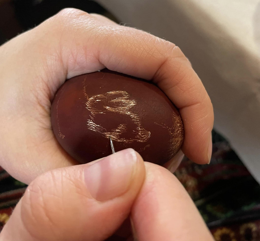 Laura rāda vienu no sarežģītākajām olu krāsošanas metodēm, kurā nepieciešama gan prasme, gan pacietība. “Es atceros, kā to darīja manas vecmāmiņas brālis Pauļonkuls. Viņš bija tas, kuram iznāca īpaši skaistas glezniņas ar pavasara ziediem, zvēriņiem, pat baznīcu.