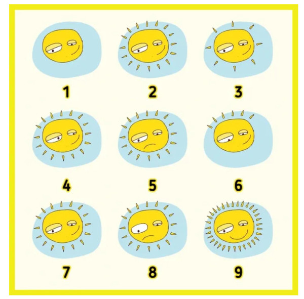 Attēlā deviņas saules tev smaida (un skumst) – bet tas nav tik vienkārši! Starp tām ir paslēpts divu identisku saulīšu pāris. Vai vari tās atrast tikai 12 sekundēs?
