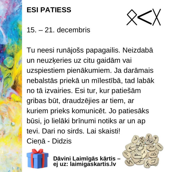 Ja darāmais nebalstās priekā un mīlestībā, tad labāk no tā izvairies. Esi tur, kur patiešām gribas būt, draudzējies ar tiem, ar kuriem prieks komunicēt. Jo patiesāks būsi, jo lielāki brīnumi notiks ar un ap tevi. Dari no sirds. Lai skaisti!