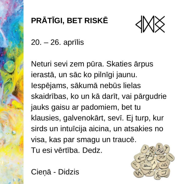 Iespējams, sākumā nebūs lielas skaidrības, ko un kā darīt, vai pārgudrie jauks gaisu ar padomiem, taču tu klausies galvenokārt sevī. Ej turp, kur sirds un intuīcija aicina, un atsakies no visa, kas par smagu un traucē. Tu esi vērtība. Dedz.