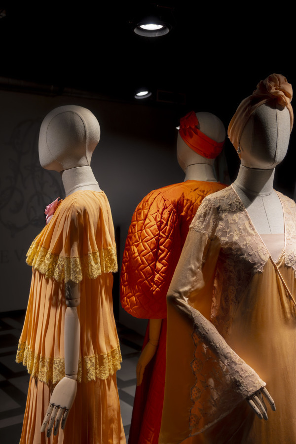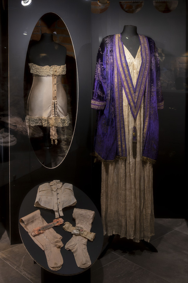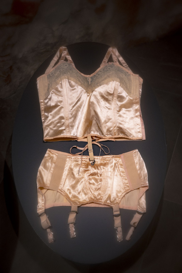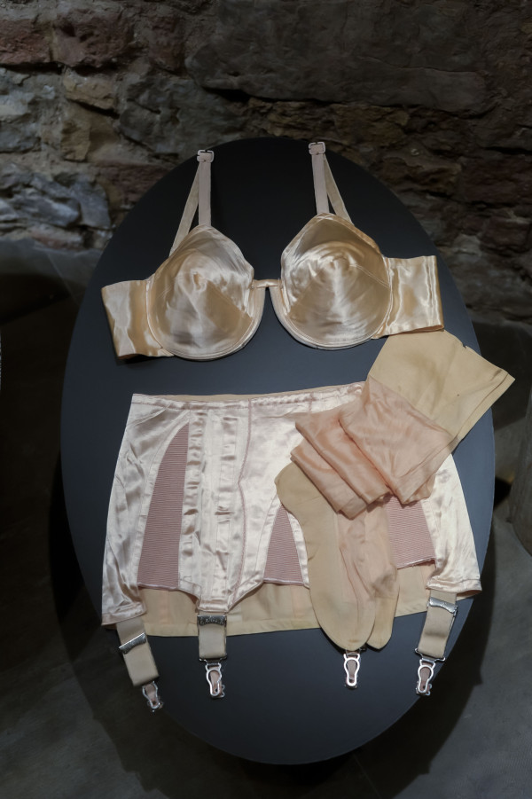 Korsetes, kombinācijas, zeķes, krūšturi un pat apakšbikses kļuvušas par redzamās modes daļu - arī šai veļas iedvesmotajai modei atvēlēta vieta izstādes vitrīnās.