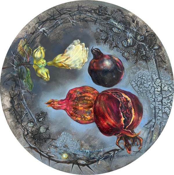 “Dieva dzirksts” (Veltījums Sergejam Paradžanovam)/2022.-2026., audekls, eļļa, autortehnika, D 40 cm. Granātābols ir viens no armēņu identitātes spilgtiem simboliem, kas īpaši aktualizējās pēc 1915. g. genocīda, kad atlikusī rietumarmēņu daļa izklīda pasaulē, un veidojās plaša diaspora, kurai bija svarīgi ne tikai izdzīvot, bet arī saglabāt vēsturisko atmiņu. Īpašu popularitāti granātābols kā dzīvības un dzimtas turpināšanās simbols ieguva pēc Sergeja Paradžanova filmas gūtajiem panākumiem. "Vispirms bija krāsa, "Granāta krāsa", kas pārvērtās gaismā. Pelēcība un trumi nespēja nomākt Gaismu. Šis darbs ir mainījies, ar katru nākošo izstādi iegūstot arvien jaunas detaļas. Manis iemīļotās sniegbaltās mežģīnes iekrāsojās melnas, baltais likteņa pavediens pārtop dzeloņstieplēs... Lauru vainags - ērkšķu vainagā..." stāsta māksliniece. / Publicitātes foto