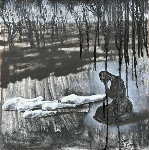 “Māte ar saviem bērniem” jeb “Melnās asaras”/2026. Pelni, audekls, eļļa, autortehnika, 50x50 cm. "Strādājot pie šī melnbaltā cikla, man bija ārkārtīgi svarīgi uzsvērt, ka manis radītie tēli balstās patiesās arhīvu liecībās, mani “modeļi” nāk no tā laika dokumentālajām fotogrāfijām, tie nav mākslinieka hiporbolizētas fantāzijas augļi. Jo īpaši balstījos uz vācu fotogrāfa pacifista Armina Teofila Vēgnera labi zināmajiem vēsturiskajiem kadriem. Te vēlos citēt profesoru Izraēlu Čarniju: "Armēņu genocīds ir zīmīgs daudzējādā ziņā, arī tāpēc, ka asiņainajā 20. gadsimtā tas bija agrīns masu genocīda piemērs, ko daudzi atzīst par Holokausta "generālmēģinājumu". Nav iespējams nevilkt paralēles starp armēņu genocīdu un holokaustu. Ļoti bieži tie bija vieni un tie paši CILVĒKI, kas pretojās necilvēkiem - ebreju slepkavām. 1933. gadā Vegners uzrakstīja atklātu vēstuli Hitleram, aicinādams viņu glābt Vāciju no neizmērojamas netaisnības un kauna, nekavējoties izbeidzot nesen sākto ebreju vajāšanu. Pēc tam Vegners pats tika represēts un ieslodzīts koncentrācijas nometnēs. Verneram tika piešķirts “Taisnīgā starp tautām” tituls," stāsta Karinē Paronjanca. / Publicitātes foto