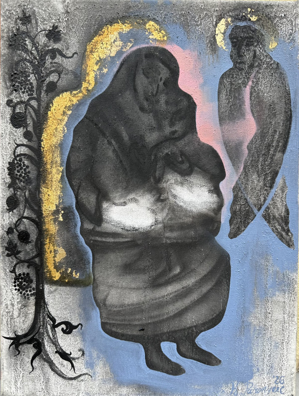 “Sargeņģelis” (veltījums Aršila Gorkija mātei)/2026. Pelni, audekls, eļļa, autortehnika, 40x30 cm. "Šajā gleznā bez jau acīmredzamās atsauces uz armēņu izcelsmes pasaulslavenā Amerikas abstrakcionista Aršila Gorkija ģimenes drāmu man bija svarīgi uzrunāt skatītāju arī caur naivām, bet ārkārtīgi izteiksmīgām formām, ko radījuši jau viduslaiku Armēnijas neprofesionālie mākslinieki un tēlnieki. Manuprāt, tieši seno armēņu tempļu bareljefu un viduslaiku miniatūrglezniecības ietekmē veidojies Aršila Gorkija neatkārtojamais un savdabīgais stils. Pastāv uzskats, ka gleznā "Mākslinieks un viņa māte" Aršils Gorkijs izdzēsis savas mātes rokas, lai uzsvērtu zaudējuma smagumu un skumjas, tā vēlēdamies izcelt ainas metafiziskumu. Šī glezna ir par neiespējamību vēlreiz sajust mātes roku siltumu," atklāj Karinē Paronjanca. / Publicitātes foto