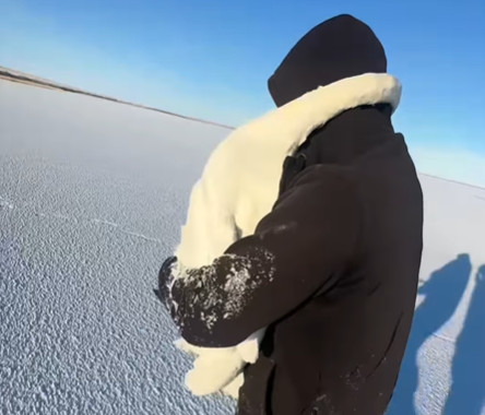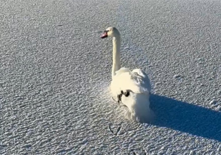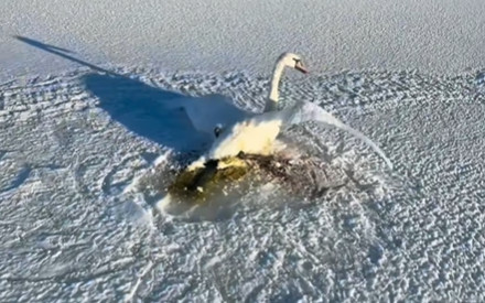 Video redzams nogurušais putns, izcelts no ledus, pateicībā apskauj glābēja kaklu. Tajā brīdī tēvs un dēls pamanīja vēl vienu gulbi uz ezera un steidzās tam palīgā.
