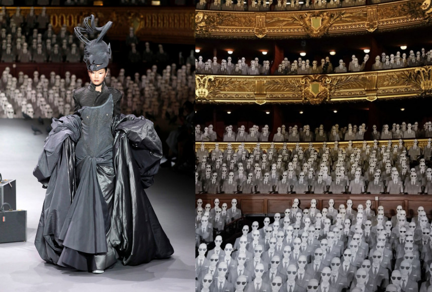 Thom Browne skatē Palais Garnier zālē sēdēja viltus skatītāji - 2000 bezpersonisku pelēku kartona figūru. Īstie skatītāji atradās uz skatuves.