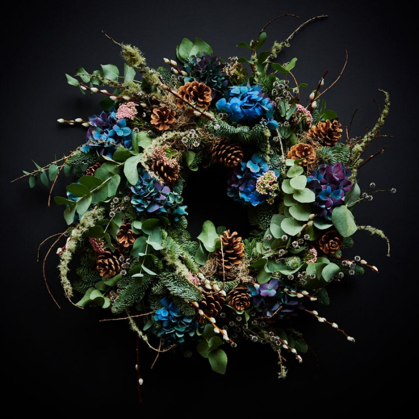 Iedvesmojoties no Latvijas ziemas ainavām, šis krāšņais spalvu Ziemassvētku vainags ir pildīts ar priežu zariņiem, šampanieša krāsas priežu čiekuriem un ogu ķekariem.