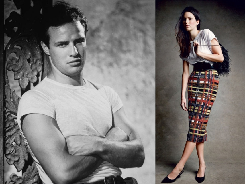 Savukārt franču kino aktieris Alēns Delons 1963.gadā Kannu kinofestivālā ir iemūžināts pusdienojam kopā ar režisoru Lučīno Viskonti, ģērbies baltā T kreklā. Atšķirībā no iepriekš pieminētiem Holivudas aktieriem, Delons krekliņā ir nevainojami elegants.