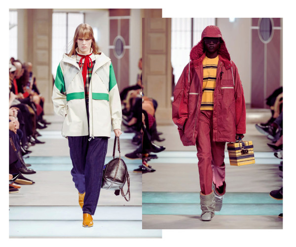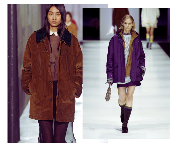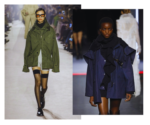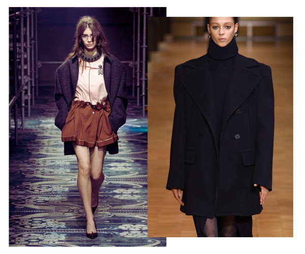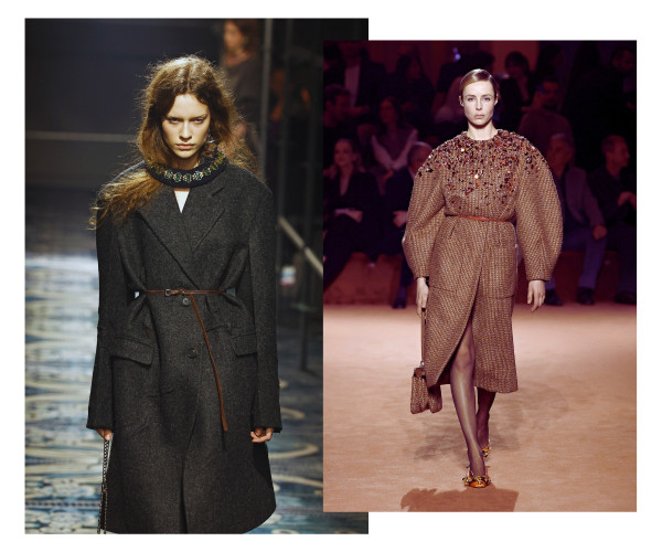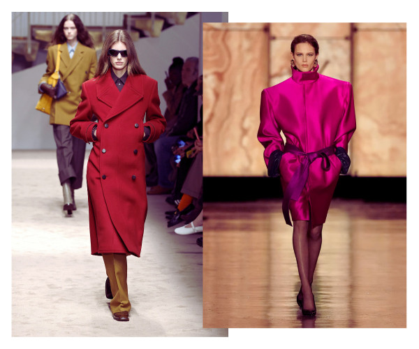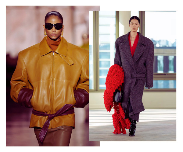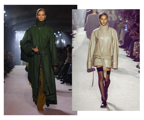 Ja pirmajā gadījumā vien ar jostas palīdzību oversize mētelim vai žaketei var piešķirt sievišķīgas aprises, tad pazeminātā jostasvieta saspēlē ar izteiksmīgu plecu līniju un masīvu augšdaļu ievieš šajā sezonā jau kādu laiku neredzētu kontrastējošu siluetu.
