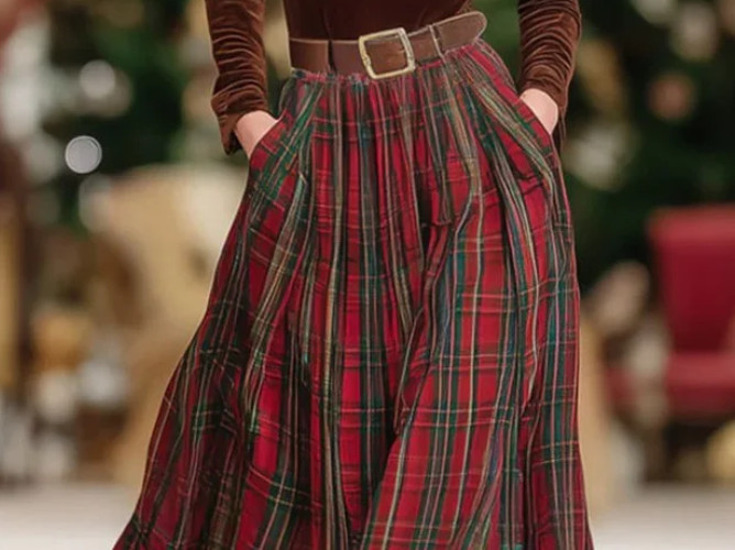 Elegantā versijā rūtains raksts parādās kā maksi svārki tumši sarkanā un melnā krāsā, kas savienoti ar melnu topu un minimālistisku somu. Zīmola pilnā izskatā trenčmētelī un cepurē ir ikoniskais bēšais rūtainais raksts, atsaucoties uz Burberry mantojumu.