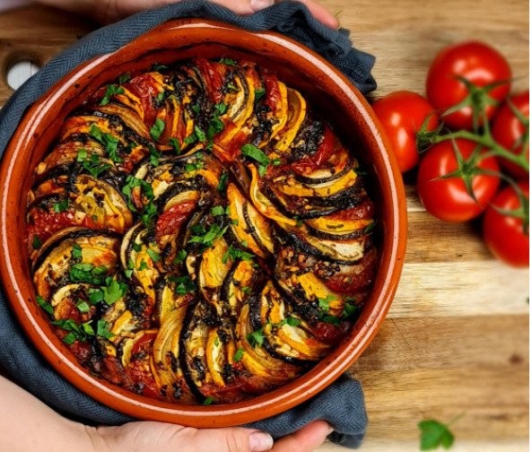 4.Trauku pārklāj ar foliju, liek iepriekš sakarsētā cepeškrāsnī un 150 grādu temperatūrā cep aptuveni 60 - 75 minūtes. Izņem no cepeškrāsns, ratatuju pārkaisa ar sasmalcinātām dillēm, baziliku un timiānu un vēl uz dažām minūtēm iešauj cepeškrāsnī.
