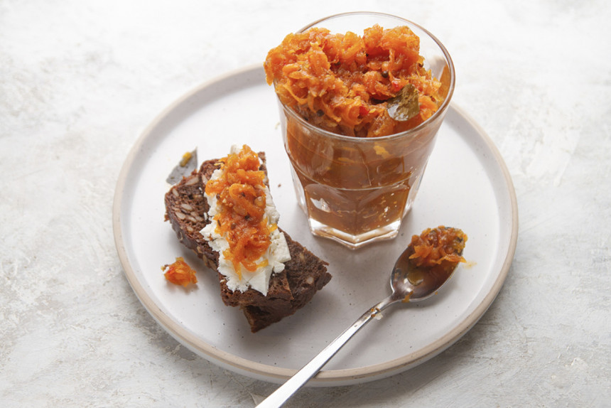 3.Pārliek stikla trauciņā, atdzesē un novieto ledusskapī. Pasniedz ar sieru, gaļu, ar maizītēm.