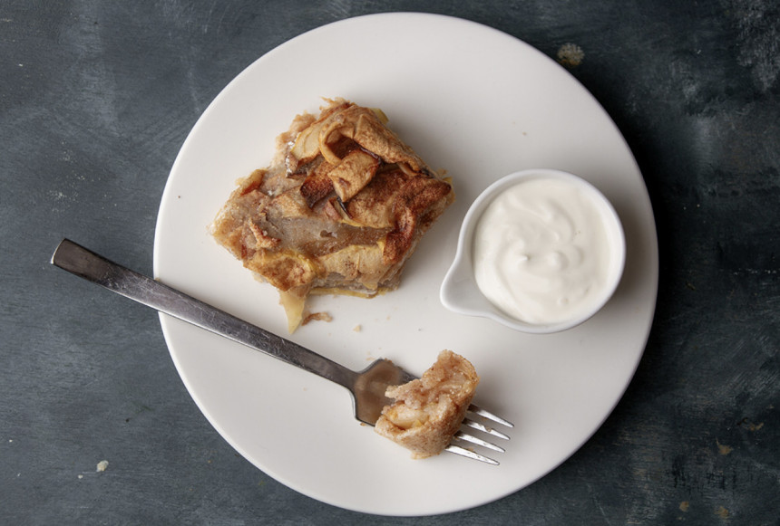 2.Karstumizturīgā formā ieber apmēram ceturtdaļu no sausā maisījuma. Pa virsu uzlej mazliet piena un uzklāj ābolu kārtu. Pārkaisa ar kanēli, tad uzber pusi no sausā maisījuma, atkal pārklāj ar ābolu kārtu, pārkaisa ar kanēli. Nobeidz ar sauso maisījumu un ābolu kārtu. Tad pārlej ar pienu un vēlreiz pārkaisa ar kanēli. Es vēl pārkaisīju ar muscovado cukuru, bet to var izlaist.