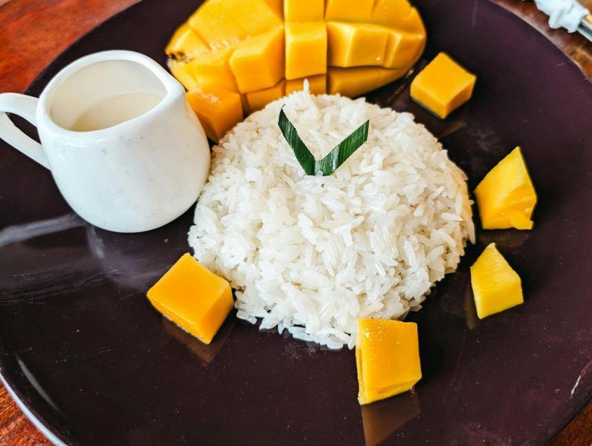 4.Mango pārlej ar laima sulas pusi. Atlikušo sulu pielej rīsiem, pievieno medu un samaisa.