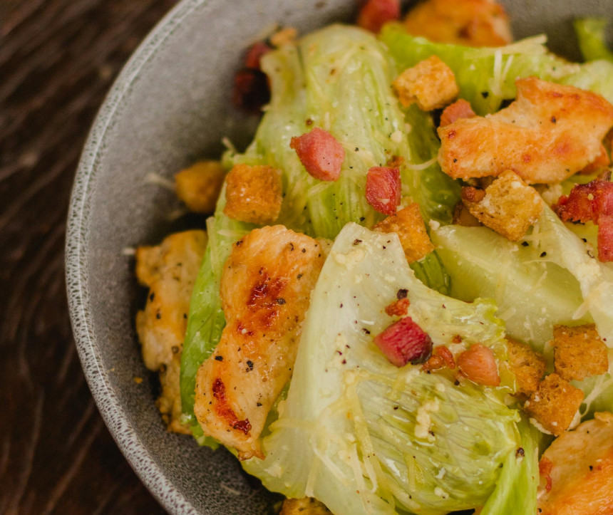 7.Romiešu salātus pārlej ar pāris ēdamkarotēm mērces un rīvētu sieru un liek uz šķīvjiem. Pa virsu izklāj vistas fileju, pārkaisa ar grauzdiņiem un sagriezto sieru. Pārlej ar atlikušo mērci vai pasniedz to trauciņos blakus.