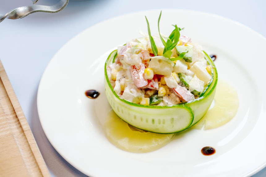 Silti krabju salāti ar kukurūzu un krēmīgu mērci