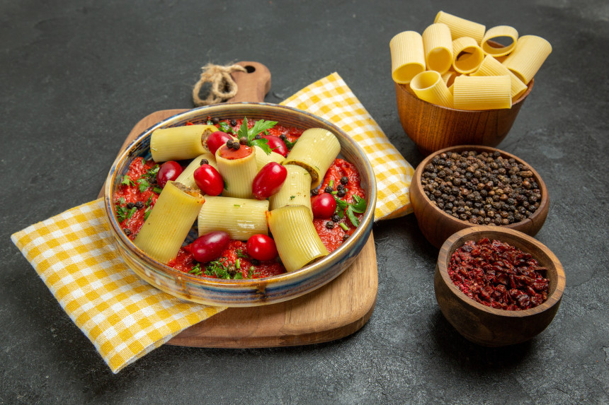 Mērcei sajauc skābo krējumu un tomātu pastu vai biezeni, pievieno sāli un piparus un atšķaidiet ar karstu ūdeni. Kārtīgi samaisiet un pārlejiet kaneloni, līdz tie ir pilnībā pārklāti.