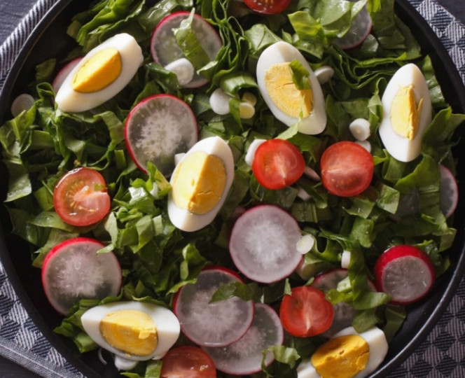Olas sagriež četrās daļās, ķiršu tomātus - uz pusēm, redīsus - apļos. Skābenes un lociņus sasmalcina.