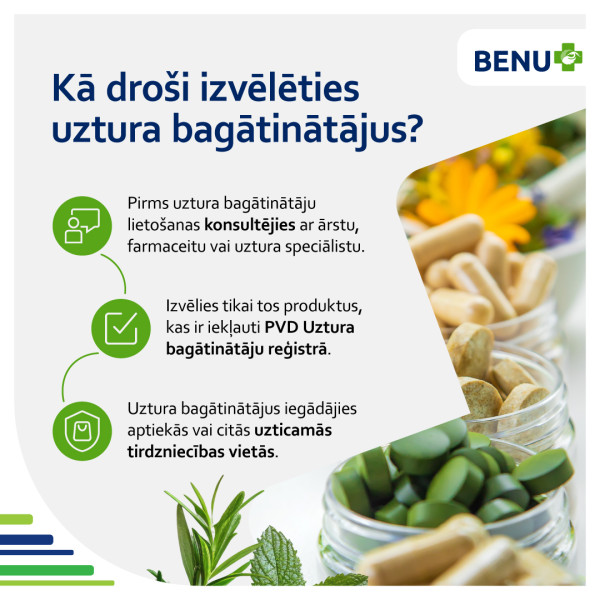 BENU Aptiekās pieejamie uztura bagātinātāji ir reģistrēti PVD Uztura bagātinātāju reģistrā. Tomēr, iegādājoties uztura bagātinātājus internetā, būtiski pārliecināties par to drošumu. Lai šādus produktus drīkstētu izplatīt, tiem jābūt iekļautiem PVD Uztura bagātinātāju reģistrā, kas ir pieejams PVD mājaslapā. Ja produkts nav reģistrēts, tā lietošana var nebūt droša un pat radīt risku veselībai, uzsver farmaceite Ilze Priedniece.