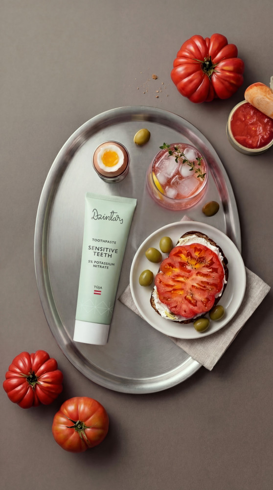 Viena no zobu pastām, kas izstrādāta tieši jutīgu zobu kopšanai, ir Latvijas kosmētikas ražotāja Dzintars zobu pasta “Tūja”. Tā izstrādāta Dzintars laboratorijā un tiek ražota Rīgā, Dzintars rūpnīcā.