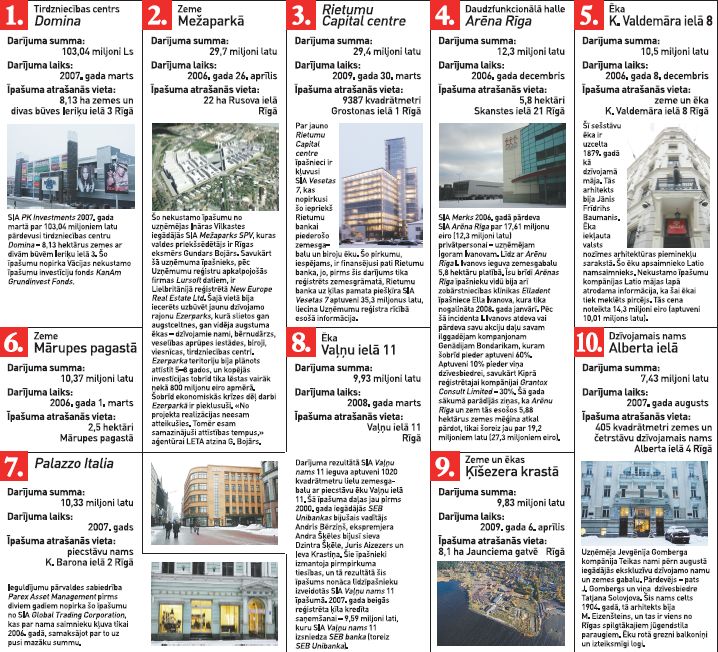 Lieliem darījumiem nekustamo īpašumu jomā īpaši bagāts bija 2006. un 2007. gads. Tad par vairāk nekā 10 miljoniem latu tika pārdota Arēna Rīga, Palazzo Italia un nedaudz virs un zem 10 miljoniem vairākas skaistas vēsturiskas ēkas Rīgas centrā – ēka K. Valdemāra ielā 8, Vaļņu ielā 11, Alberta ielā 4.