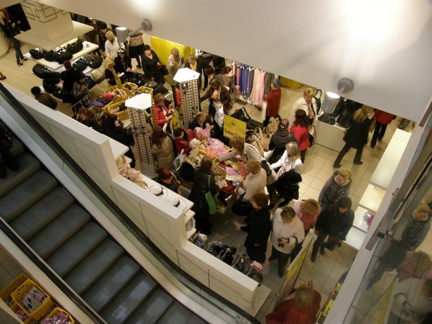 Cilvēku pūlis kļuva rosīgāks vien pēc stundas, ap deviņiem, kad lielveikalā parādījās manāmi vairāk apmeklētāju. Tiesa, citus gadus novērotā grūstīšanās un "bezdomu" preču grābšana izpalika. Pat pie vienmēr tik kārotajiem stendiem, kuros pārdod lētākus ceļojumus un aviobiļetes, astoņos no rīta bija vien daži cilvēki, kuri acīmredzot tiešām nāca ar vienu, konkrētu mērķi.