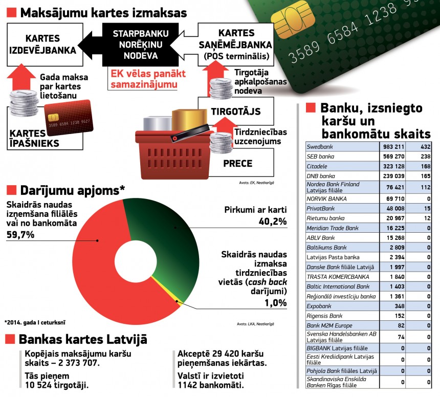 Latvijas Komercbanku asociācijas (LKA) apkopotā informācija liecina, ka šī gada trešā ceturkšņa beigās Latvijā strādājošās bankas bija izsniegušas vairāk nekā 2,37 miljonus maksājumu karšu - tātad vairāk nekā Latvijā iedzīvotāju. Šā gada pirmajā ceturksnī ar maksājumu kartēm veikti 43 miljoni pirkumu un katru reizi, kad pircējs maskā ar bankas karti, tirgotājam ir jāmaksā nodeva bankai, kas uzstādījusi POS termināli. Tirgotāji šo nodevu ierēķina preces uzcenojumā, un rezultātā par to samaksā pircējs. Arī bankas maksā viena otrai par maksājumu karšu apkalpošanu tirdzniecības vietās. To, cik lielas ir šī komisijas maksas, bankas neklāj, aizbildinoties, ka „ 90% no starpbanku komisijām ir atrunātas divpusējos starpbanku līgumos, kas ir komerclīgumi un tātad nav publiski pieejami.”