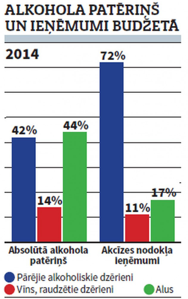 Pēc LANA aprēķiniem, no 2008. līdz 2014. gadam akcīzes likme alkoholiskajiem dzērieniem pieauga par 49%, bet valsts ieņēmumi samazinājās par 30 miljoniem eiro gadā. Legālie pārdošanas apjomi samazinājās par 38%, līdz ar to nodarbinātība nozarē arī kļuva apmēram par 30% mazāka. Jāpiebilst, ka valsts budžetā legālā alkohola tirgus kopumā ienes apmēram 240 miljonus eiro gadā.