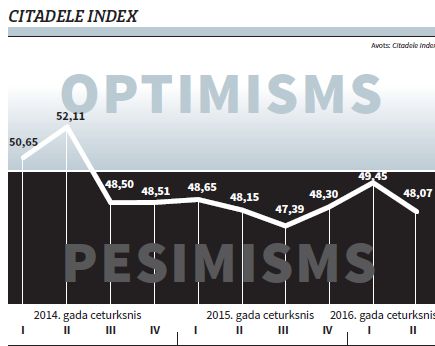 Citadele Index vērtība (tas, ir uzņēmēju kopējais noskaņojums vērtību skalā no 0 līdz 100) šā gada 2. ceturksnī ir 48,07 punkti, kas ir par 1,38 punktiem mazāk nekā gada sākumā. Pieņemot, ka robežšķirtne starp optimistisku un pesimistisku noskaņojumu ir 50 punkti, jāsecina, ka uzņēmēji Latvijā pēdējo divarpus gadu laikā ir bijuši pesimistiskāk noskaņoti nekā piemēram, 2012. vai 2013. gadā.