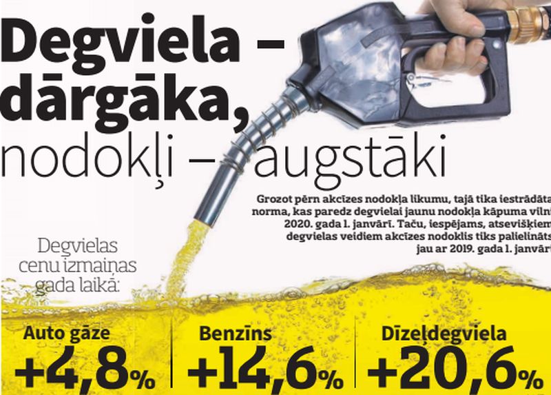 Grozot pērn akcīzes nodokļa likumu, tajā tika iestrādāta norma, kas paredz degvielai jaunu nodokļa kāpuma vilni 2020. gada 1. janvārī. Akcīzes nodoklis benzīnam pieaugtu par aptuveni 4 centiem (ieskaitot PVN) litrā, dīzeļdegvielai - par 5 centiem (ieskaitot PVN) litrā. Taču, iespējams, atsevišķiem degvielas veidiem akcīzes nodoklis tiks palielināts jau ar 2019. gada 1. janvāri.