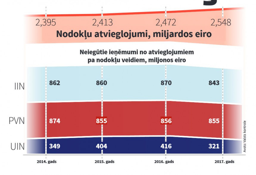 Valsts kontrole (VK) pirms desmit gadiem Finanšu ministrijai norādīja uz nepieciešamību izvērtēt nodokļu atvieglojumu sistēmu kopumā un apzināt izmaksas, kas valstij rodas, administrējot tos. Šo desmit gadu laikā būtiski nekas nav mainījies – nodokļu atlaides joprojām tiek piešķirtas bez noteikta mērķa un neizvērtējot to efektivitāti. Valsts kontrole ir aprēķinājusi, ka valsts budžets šo atvieglojumu dēļ ik gadu neiegūst aptuveni 2,5 miljardus eiro.