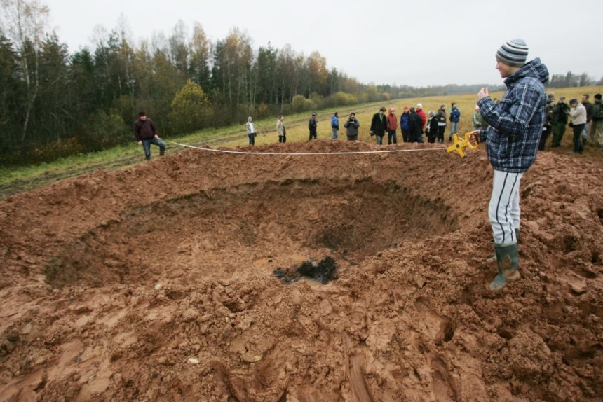Saimnieks Harijs Krastiņš, uz kura zemes pagājušā gada 25.oktobra vakarā tika inscenēta meteorīta nokrišana, bedri nav aizbēris. Pa šo laiku "Tele2" izvietojusi norādes, kur bedri meklēt.