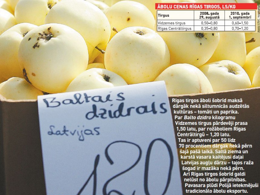 Saltā ziema un karstā vasara kaitējusi daļai Latvijas augļudārzu – tajos raža šogad ir mazāka nekā pērn. Arī Rīgas tirgos šobrīd galdi nelūst no ābolu pārpilnības. Āboli lielākoties tiek pārdoti kopā ar citiem augļiem, un tikai atsevišķi pārdevēji vilina pircējus ar plašu ābolu šķirņu klāstu. Vidzemes tirgū Baltos dzidros vakar varēja nopirkt par 1,20 līdz 1,50 latiem kilogramā, īpaši saldās Konfetnaja šķirnes ābolu kilograms maksāja 1,40 latus kilogramā. Rožābolu cena turējās ap 1,50 latu kilogramā, bet Melba – 0,60 līdz 1,00 lata robežās. Vakar Vidzemes tirgū varēja nopirkt jau arī rudens šķirnes Antonovka ābolus. Rīgas Centrāltirgū, kur ābolu pārdevēju vairāk, arī cenas vakar bija nedaudz zemākas nekā Vidzemes tirgū – rožābolu kilograms maksāja 1,20 latus, Baltie dzidrie – no 0,80 līdz 1,00 latam kilogramā. No Lietuvas (vismaz tā apgalvoja pārdevēji) atvestie āboli maksāja 0,70 latus kilogramā. Pie atsevišķiem pārdevējiem neizskatīgus un mazus ābolīšus varēja atrast arī par 40 santīmiem kilogramā.