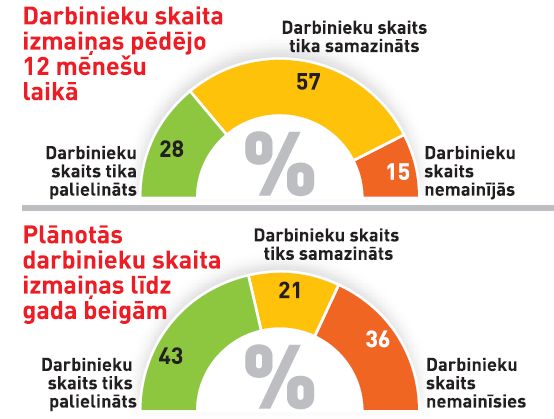 Iepriekšējo 12 mēnešu laikā vairāk nekā pusē organizāciju (57 procentiem no pētījumā iesaistītā 241 uzņēmuma) darbinieku skaits ticis samazināts, taču šis samazinājums bijis mazāks nekā 2009. gadā.