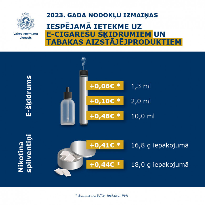 Tādēļ no 2023. gada 1. janvāra varētu pieaugt minēto produktu mazumtirdzniecības cenas. Līdz ar likmju maiņu šo produktu apritē iesaistītajiem komersantiem jāveic inventarizācija un jāsamaksā akcīzes nodokļa starpības summa par krājumā esošajiem tabakas izstrādājumiem un e-šķidrumiem.