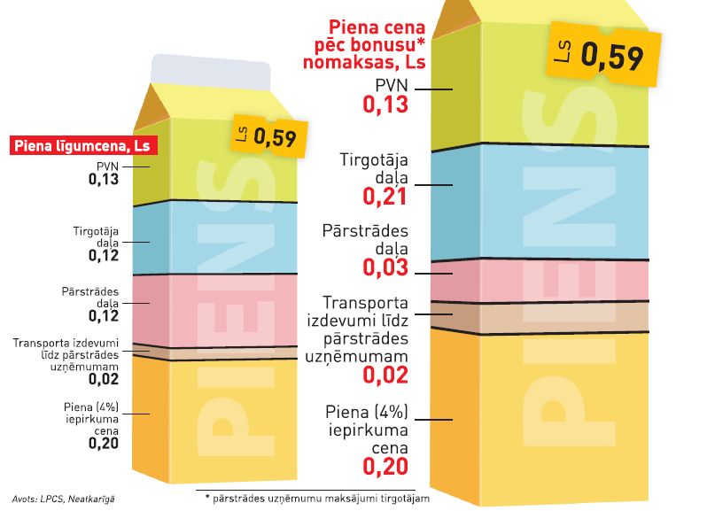 Piena produktu ražotājs saskaņā ar līgumu tirgotājam pienu piegādājis par 0,34 latiem, savukārt 0,12 latu ir pielicis tirgotājs.
