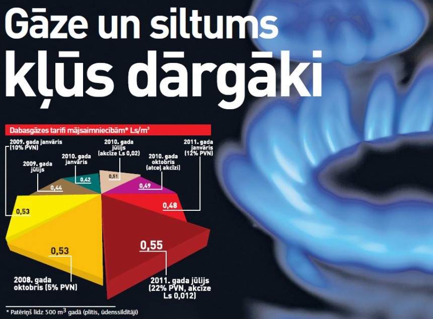 Lai gan pagājušā gada nogalē ekonomikas ministrs Artis Kampars pēc Latvijas delegācijas sarunām ar Krievijas premjeru Vladimiru Putinu atgriezās Latvijā ar priecīgu ziņu – viņam izdevies panākt gāzes iepirkuma cenas samazinājumu par 15 procentiem 2011. gada piegādēm, tomēr gada vidū – 1. jūlijā – gāzes tarifs kāps gan mājsaimniecībām, gan rūpnieciskajiem klientiem. Pēc Latvijas gāzes (LG) aprēķiniem, dabasgāzes kubikmetra cena plītiņu lietotājiem pieaugs no 48 santīmiem līdz 55 santīmiem. Tātad dabasgāzes izmantošana kļūs par septiņiem santīmiem kubikmetrā dārgāka. Viena santīma pieaugumu dodot dabasgāzes cenas izmaiņas, bet seši santīmi ir tieša nodokļu politikas ietekme. Savukārt tiem, kuri gāzi izmanto apkurē, kubikmetra cena pieaugs no 29 santīmiem līdz 34 santīmiem, no kā viens santīms ir dabasgāzes cenas pieaugums, bet četri santīmi ir nodokļu izmaiņas.