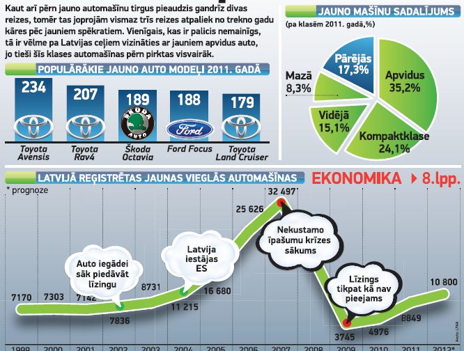 Pagājušā gada laikā Latvijā pirmā reģistrācija tika veikta 43 468 automašīnām, no tām aptuveni piektā daļa jeb 8849 spēkrati bija jauni. Viens no iemesliem, kas pērn stimulēja jaunu auto iegādi, bija iespēja iegādāties tos līzingā. Latvijas Pilnvaroto autotirgotāju asociācijas (LPAA) prezidents Andris Kulbergs pavēstīja, ka pērn vairāk nekā pusi no pasažieru automobiļu korporatīvajiem iepirkumiem ir finansējušas līzinga kompānijas, savukārt privātpersonas līzinga kompāniju finansējumu ir saņēmušas 40% pirkumu.