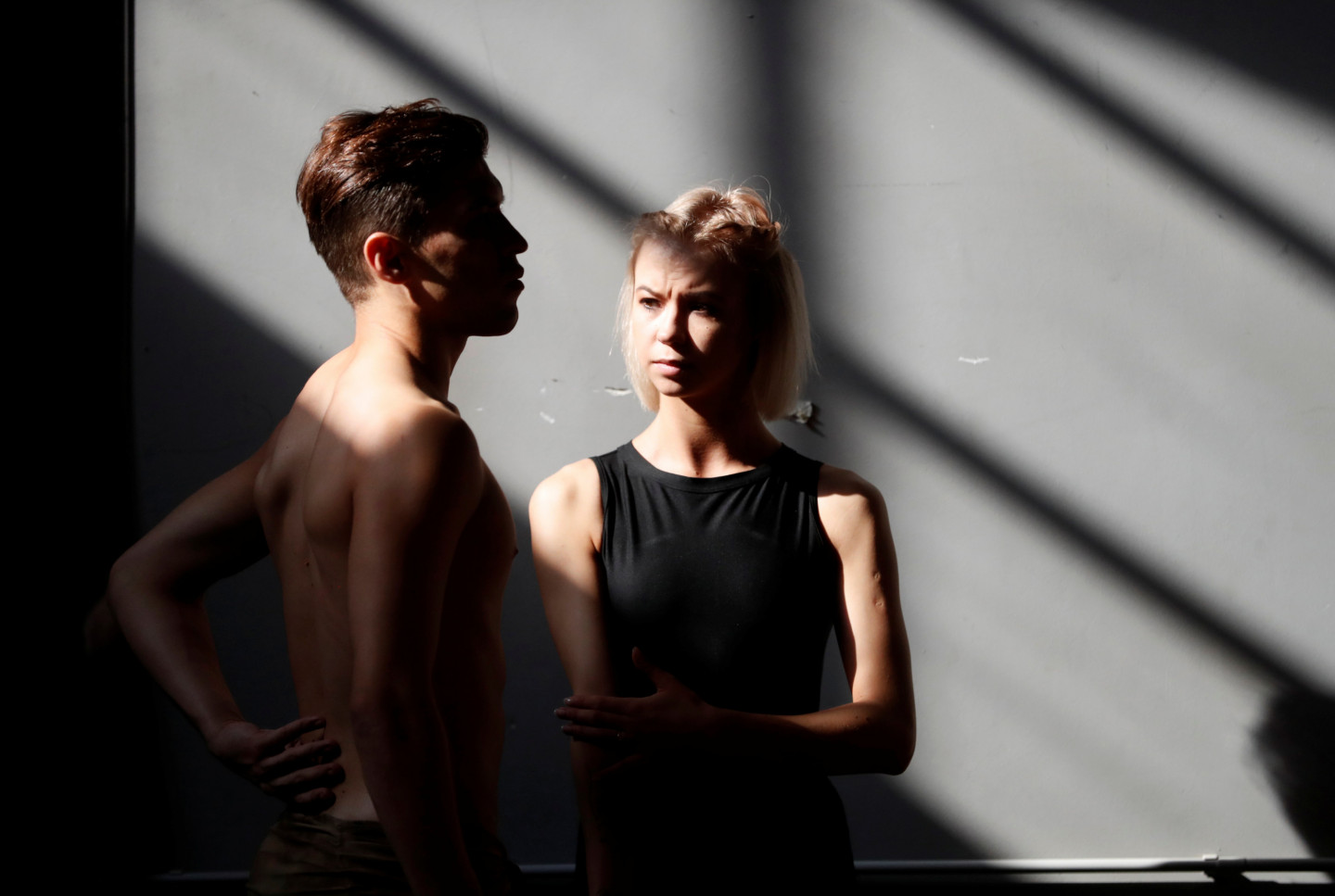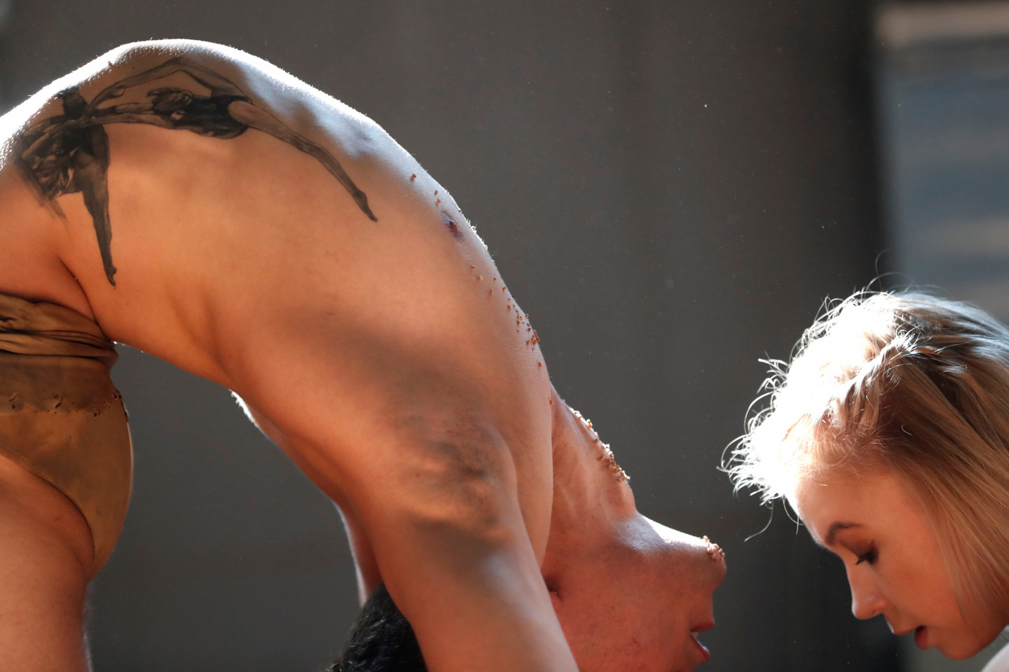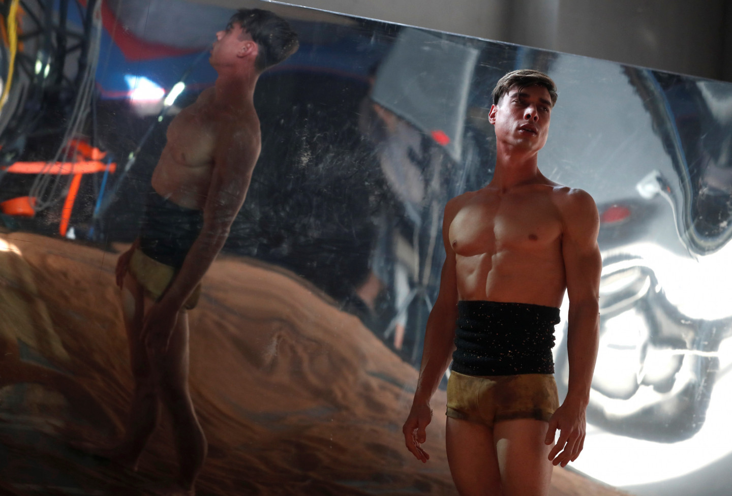 Fotogrāfam izdevies iemūžināt, kā gaidāmajam koncertam gatavojas kompānijas "Recirquel" dejotāji.