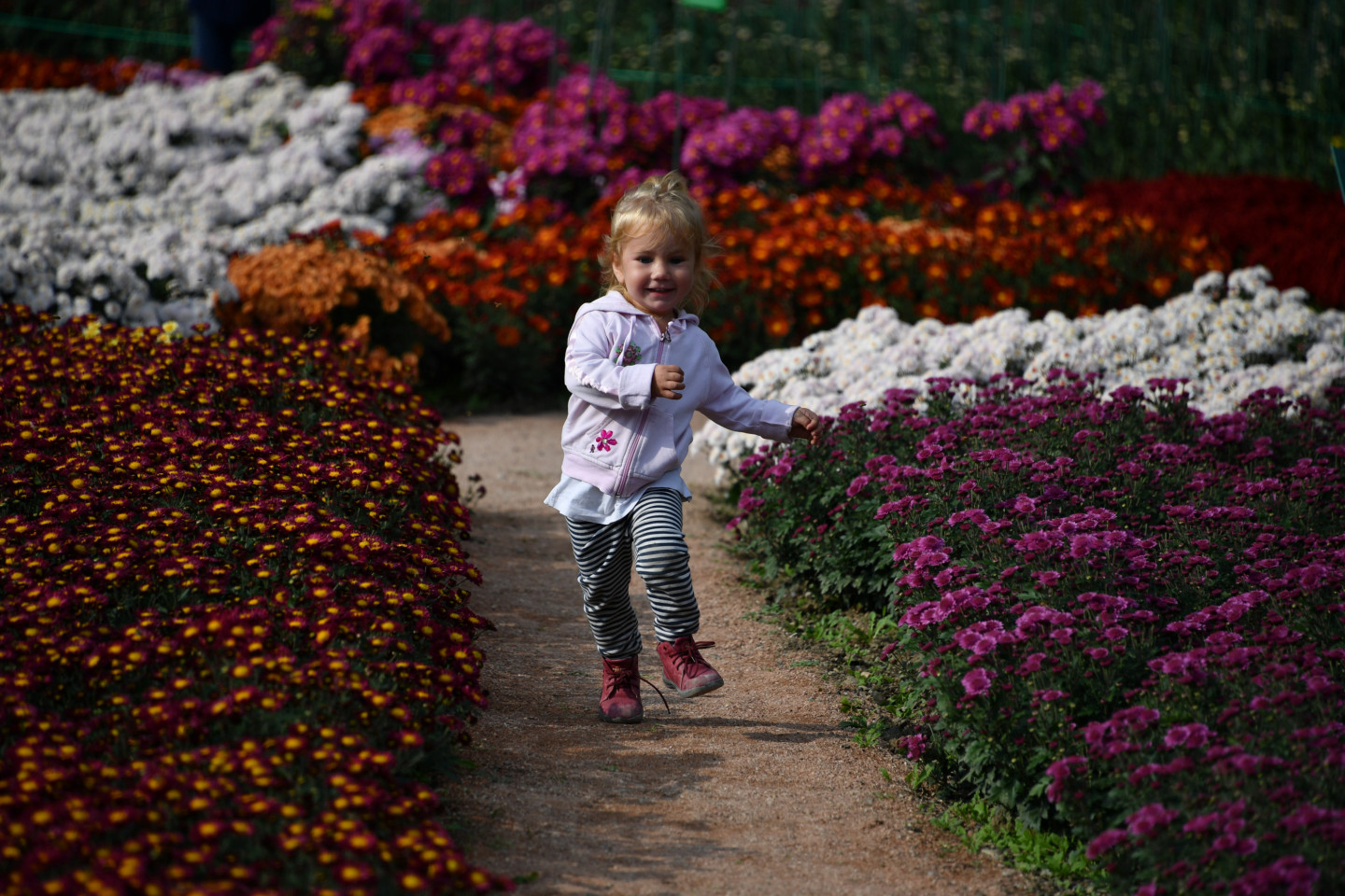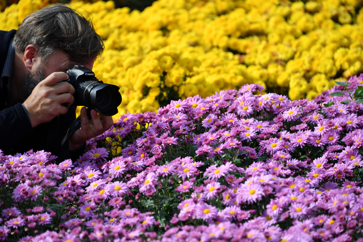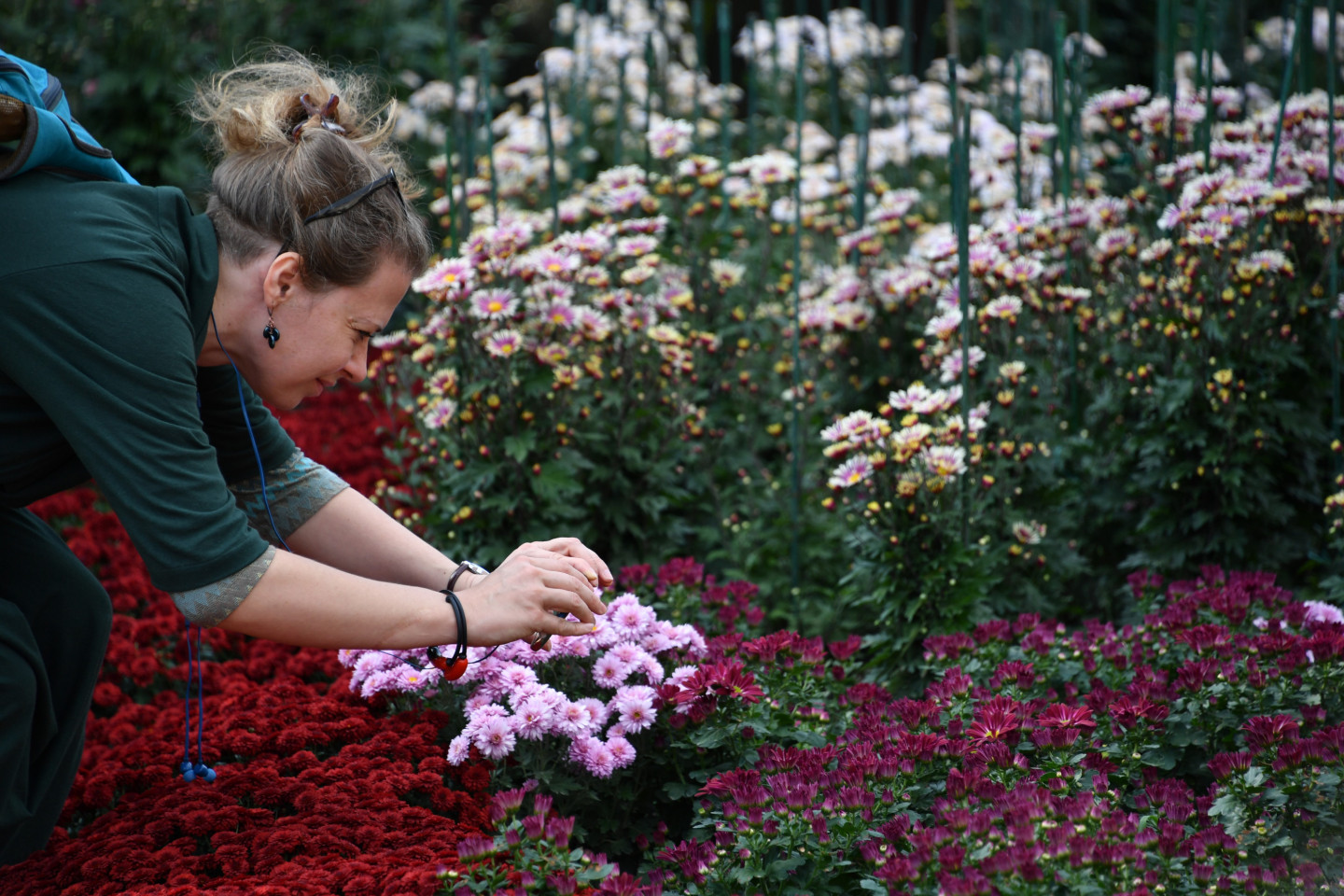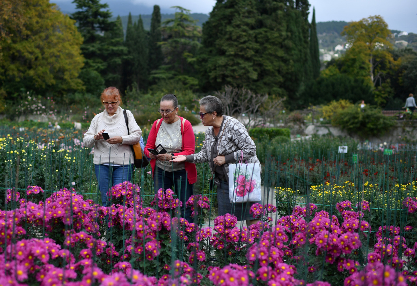 Cilvēki sajūsminās par ziediem botāniskajā dārzā Krimā