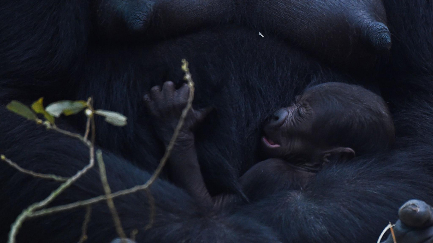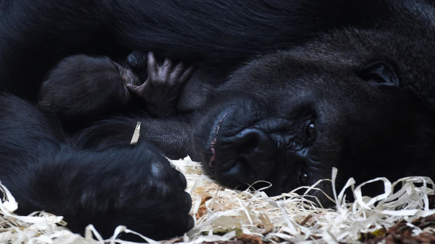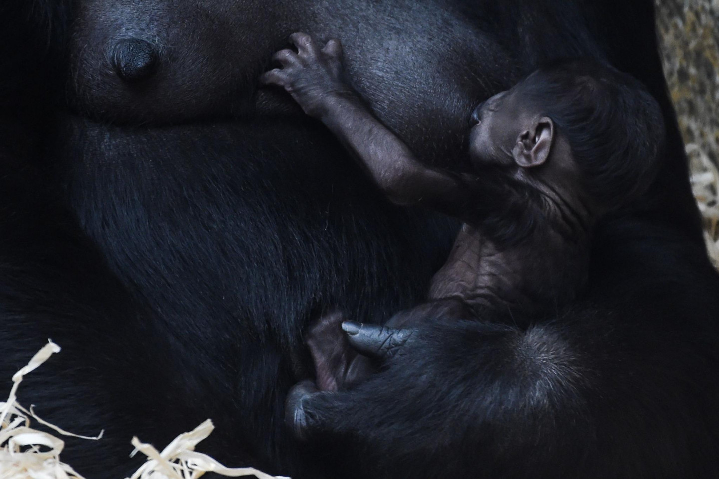 Zoodārzā Francijā iemūžināts, kā nesen dzimis gorillu mazulis atpūšas māmiņas rokās.